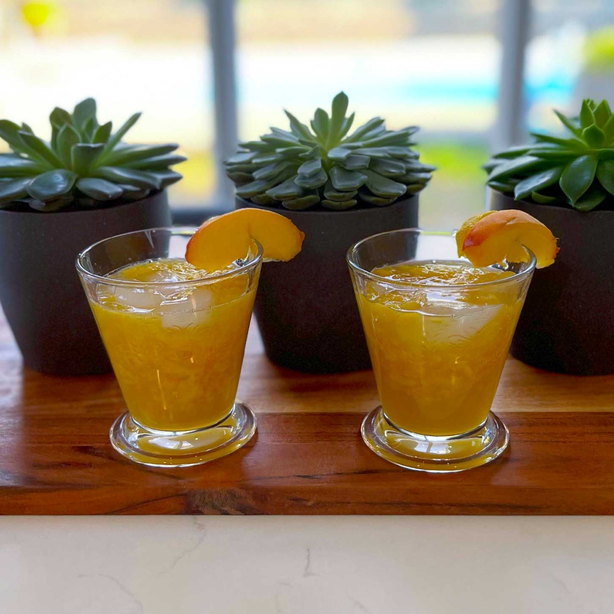 If you do not like a drink quite so rustic, you could puree the peaches with the lemon juice - one ounce of lemon juice per peach. Each peach makes two drinks. This could be done ahead of time and refrigerated. The drink will be less ‘chunky’ – Mixologist’s preference.